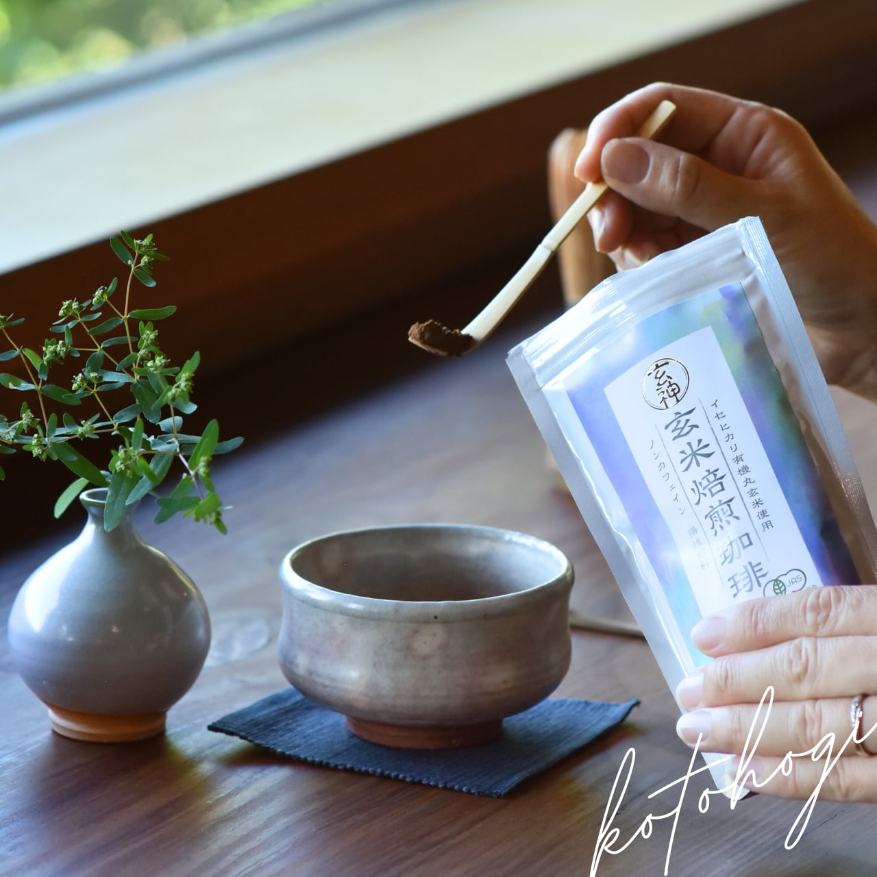 寿ぎの玄米焙煎珈琲は、イセヒカリ有機丸玄米のみをじっくり焙煎し、パウダーにした珈琲風陽性ノンカフェイン飲料です。お湯に溶いて簡単に飲むことができます。